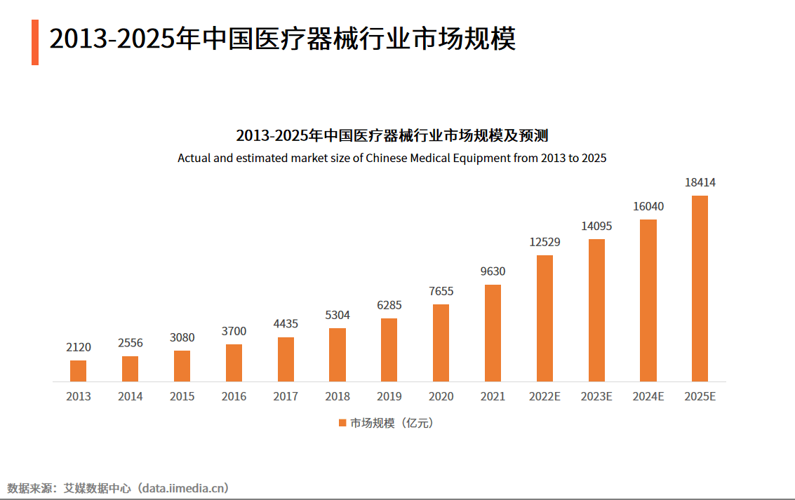 相关数据显示,自2013年以来,我国医疗器械行业市场规模不断扩大,预计2022年达12529亿元,2025年将达18414亿元。艾媒咨询分析师认为,随着产业发展政策环境持续优化,以及公众对医疗器械诊断精准化的需求日趋强烈,未来中国医疗器械行业市场规模,将会保持稳定增长态势。