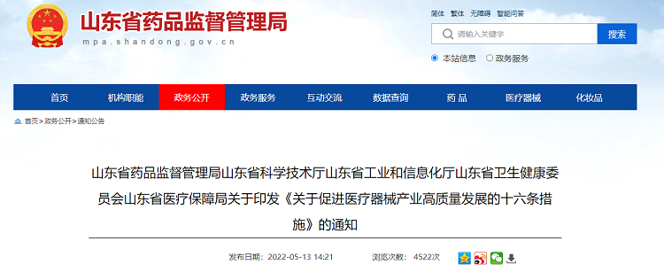近日,山东省药监局、省科技厅、省工信厅、省卫健委、省医保局联合印发《关于促进医疗器械产业高质量发展的十六条措施》(以下简称《措施》)。