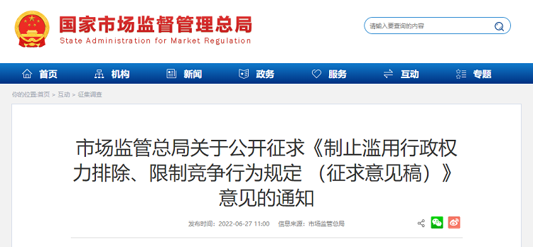 为此,国家市场监督管理总局于今日(6月27日)配套印发了《制止滥用行政权力排除、限制竞争行为规定(征求意见稿)》(简称“规定”),进一步加强和改进制止滥用行政权力排除、限制竞争反垄断执法,改善了现行规定中执法刚性较弱、执法权威不足等问题。