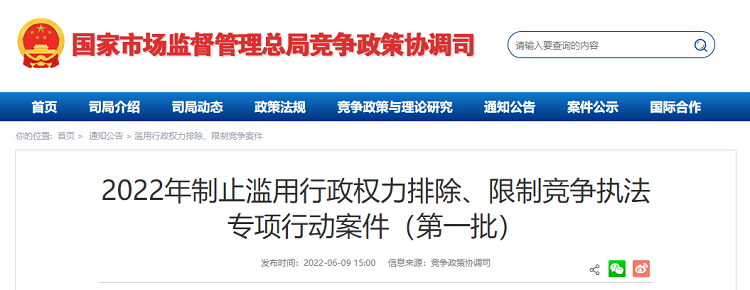 就在近日,国家市场监督管理总局发了的《2022年制止滥用行政权力排除、限制竞争执法专项行动案件(第一批)》,公开点名12起滥用行政权力排除、限制竞争的相关案件。