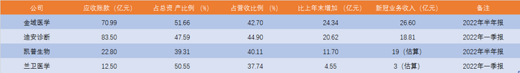 凯普生物医学实验室上半年完成新冠检测超2.6亿人次,应收账款达到22.8亿元,比年初翻番。兰卫医学一季度应收账款12.5亿元,比年初增长57.31%,货币资金2.44亿元,比年初减少30.54%。