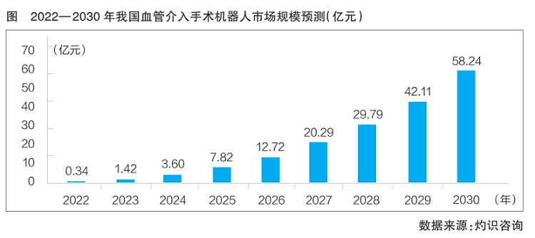 我国血管介入手术机器人行业虽起步较晚,但其市场规模增长潜力巨大。灼识咨询数据显示,预计今年我国血管介入手术机器人市场将达到0.34亿元,并将于2030年达到58.24亿元;2022—2030年复合年增长率为90.3%,超过全球血管介入手术机器人市场规模增速。